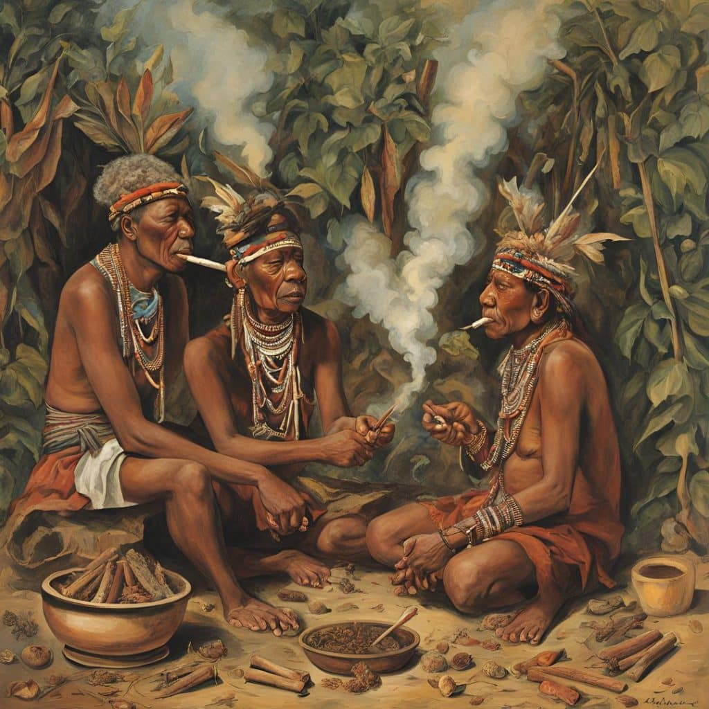 Dans les cérémonies et les rituels, le tabac est souvent pratiqué sous forme de fumée, de jus ou de poudre pour purifier l’espace, protéger les participants et ouvrir des canaux de communication avec le monde invisible.